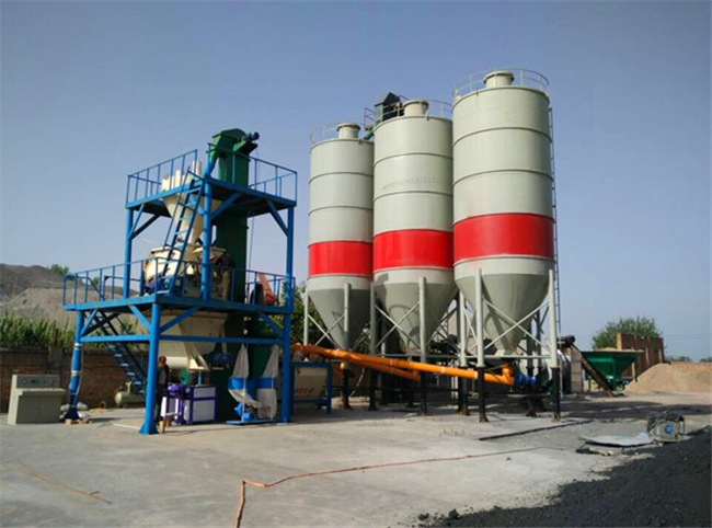 主要由提升輸送系統、計量配料系統、混合系統、儲料系統、包裝系統、除塵系統、控制系統、鋼架平臺等組成。